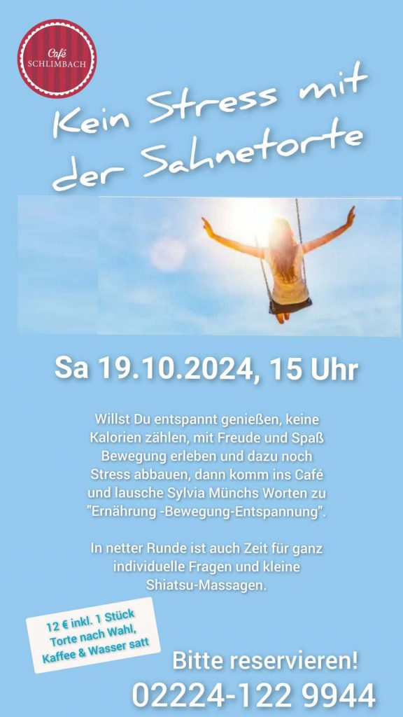 Dann komm am Samstag, den 19.10.2024 um 15 Uhr ins Café und lausche Sylvia Münchs Worten zu „Ernährung-Bewegung-Entspannung“.