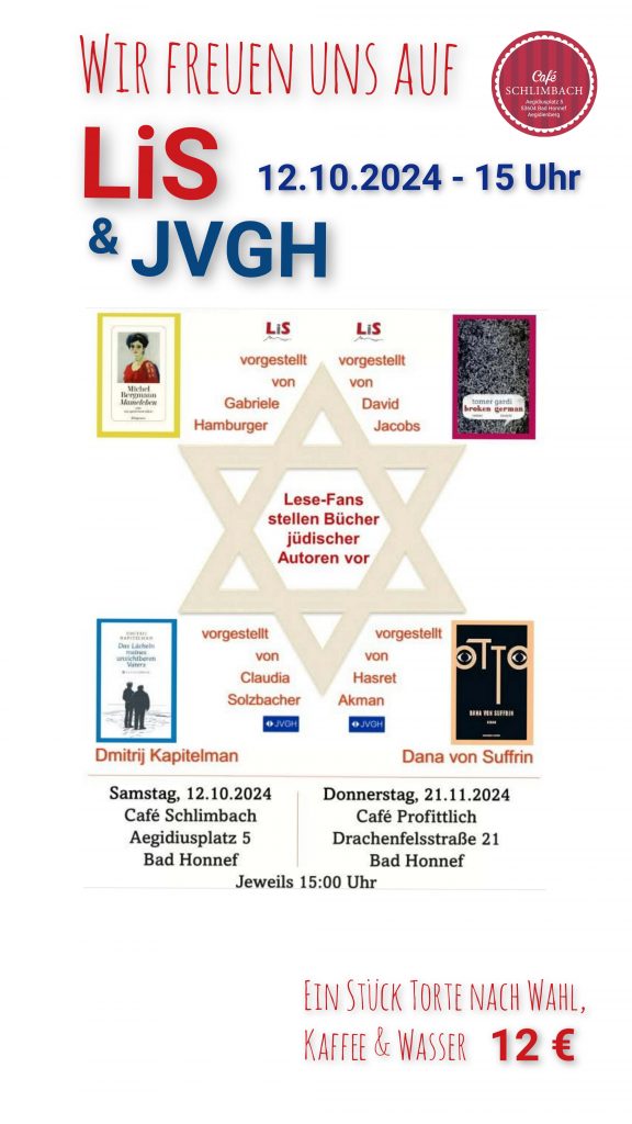 Der Verein „Literatur im Siebengebirge e.V.“ setzt seine erfolgreiche Veranstaltungsreihe der Literaturcafés fort. Erstmals kooperiert LiS dabei mit dem Verein „Jüdische Vergangenheit und Gegenwart in Bad Honnef e.V.“  „Mit diesen beiden Veranstaltungen wollen wir die Chancen nutzen, die eine Kooperation beiden Vereinen bietet.  Das verspricht eine sehr fruchtbare Zusammenarbeit zu werden“, meint David Jacobs von LiS. „Lesefans beider Vereine werden bei Kaffee und Kuchen schnell ins Gespräch kommen. Die Mischung von kurzweilig, aber fundiert präsentierten Leseempfehlungen und gemütlicher Plauderei unter Gleichgesinnten kommt gut an. Alle Literaturcafés der letzten Jahre waren gut besucht!“